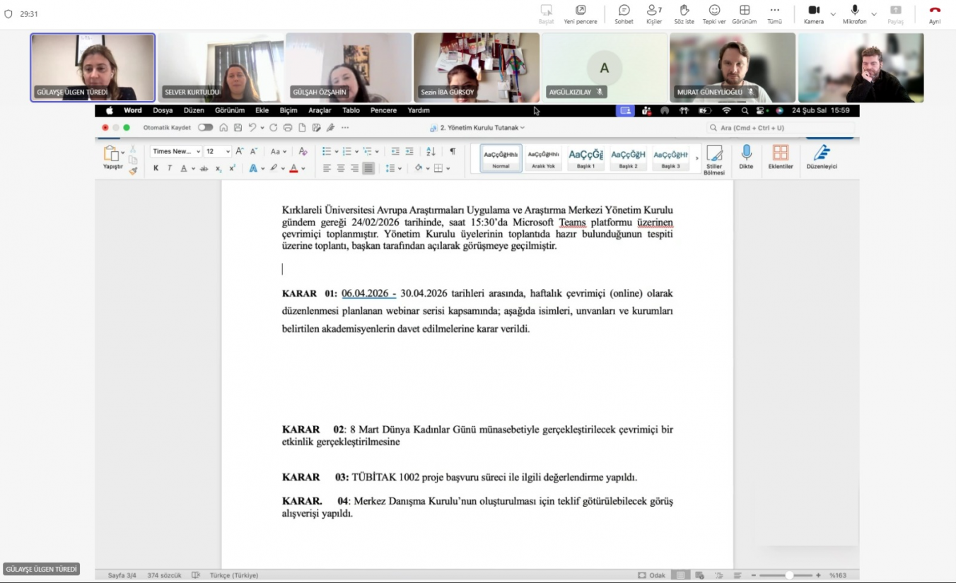 Avrupa Araştırmaları Uygulama ve Araştırma Merkezi, 24 Şubat 2026 tarihinde çevrimiçi olarak Yönetim Kurulu Toplantısını gerçekleştirdi. Toplantıya Merkez Müdür V. Dr. Öğr. Üyesi Gülayşe Ülgen Türedi; Merkez Müdür Yardımcıları Dr. Öğr. Üyesi Aygül Kızılay Güneylioğlu ve Dr. Öğr. Üyesi Altuğ Koç; yönetim kurulu üyeleri Doç. Dr. Murat Güneylioğlu, Doç. Dr. Sezin İba Gürsoy, Dr. Öğr. Üyesi Gülşah Özşahin ve Dr. Öğr. Üyesi Selver Kurtuldu katıldı.