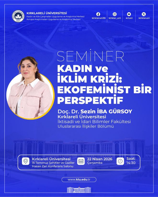 Kırklareli Üniversitesi bünyesinde faaliyet gösteren Kadın ve Aile Çalışmaları Uygulama ve Araştırma Merkezi ile Avrupa Araştırmaları Uygulama ve Araştırma Merkezi iş birliğinde düzenlenen “Kadın ve İklim Krizi: Ekofeminist Bir Perspektif” başlıklı seminer, 22 Nisan 2026 Çarşamba günü 14.30’da Kırklareli Üniversitesi 15 Temmuz Şehitler ve Gaziler Hasan Zan Konferans Salonu’nda Uluslararası İlişkiler Bölümü öğretim üyesi Doç. Dr. Sezin İba Gürsoy'un katılımıyla gerçekleştirilecektir.